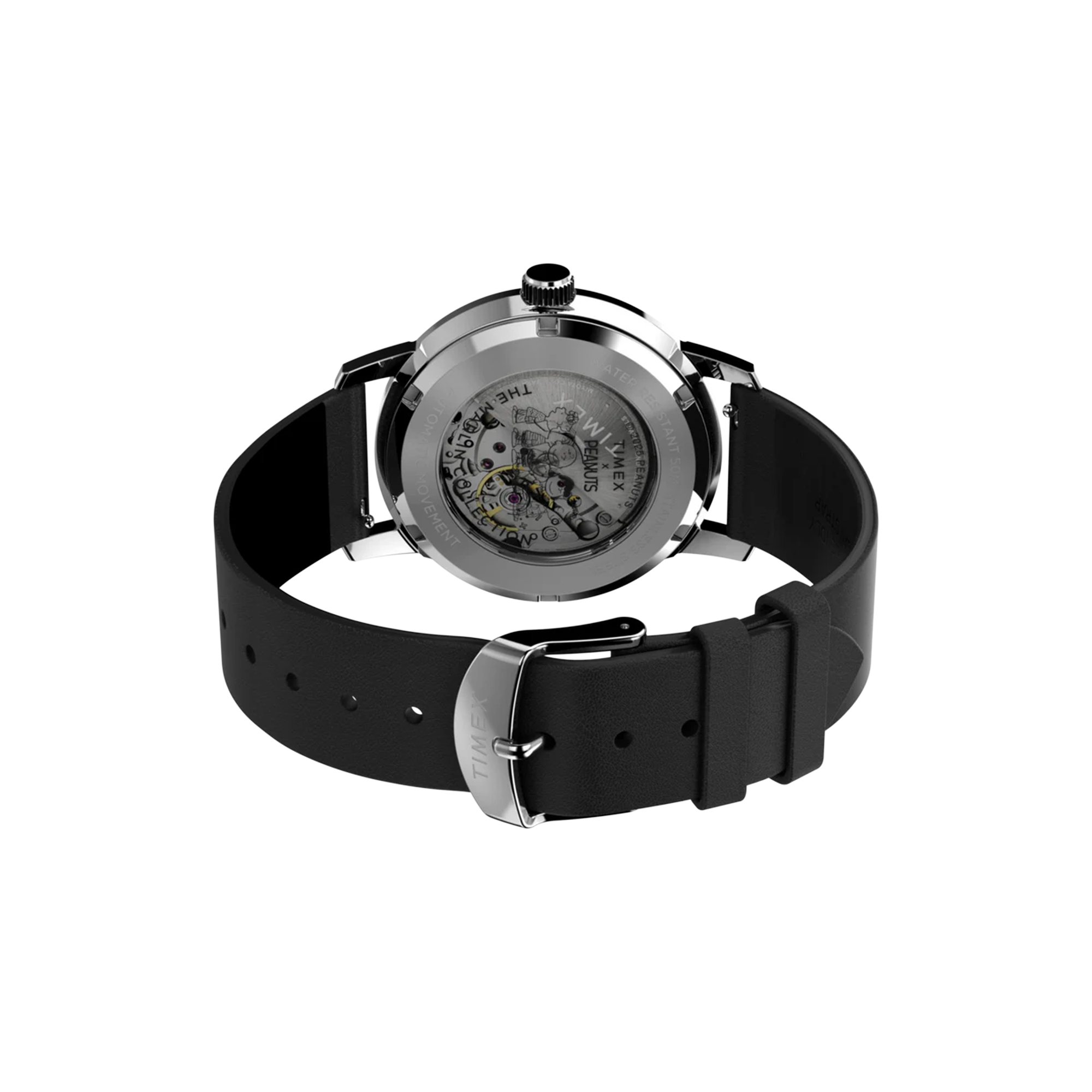 A space-inspired, vintage-aesthetic timepiece from the Timex × Peanuts line, the Marlin Automatic “Space” blends classic mechanical watch design with subtle Peanuts theming. Housed in a polished stainless steel case with a leather strap, it features a skeleton-style dial that reveals inner movement details, giving it a timeless yet technical look.